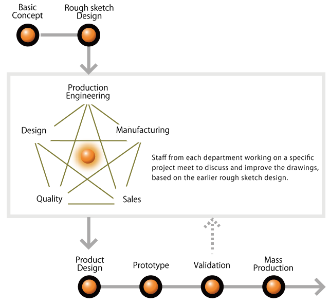 In pursuit of an efficient development process, we have established technical centers in Japan and in China. Working together between such departments as Advances Development, Design, Testing and Evaluation, Production Engineering, and Quality Assurance at these sites, Sango promotes a speedy process from product development till mass production preparations.