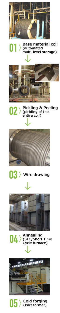 Using wire as the raw material, after a pickling process to remove scale and coat the wire, it goes through a cold drawing process and the finished product is once again put into a coiled state. By combining heat treatment, wire drawing, and coating processes, Sango provides the right material for the customer's following process.