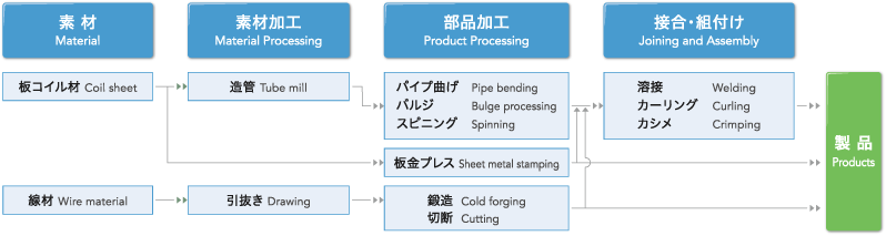 素材から素材加工、更に部品へと加工し、それらを接合、組付けして製品へと仕上げる一貫生産を行っています。